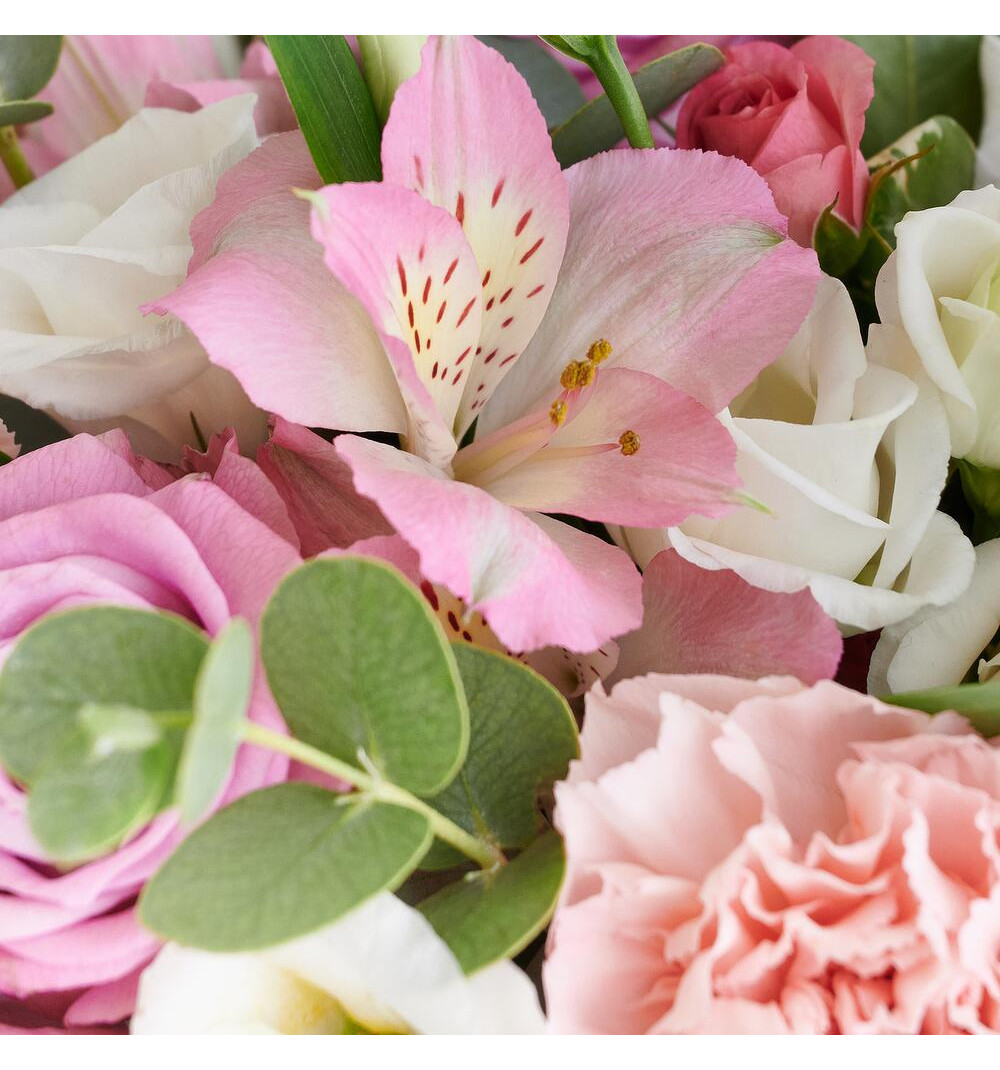 Коробочка Лилибет - это изящный букет, включающий в себя прекрасное сочетание свежих цветов. Розы, альстромерии и диантусы создают нежное и романтическое настроение, а лента атласная добавляет изысканности. Зелень питтоспорума и эвкалипта придают композиции особый шарм. Этот уникальный букет будет прекрасным подарком для особенного человека и запомнится надолго. Коробочка Лилибет - это творение из красоты и любви, которое украсит любое торжественное событие.